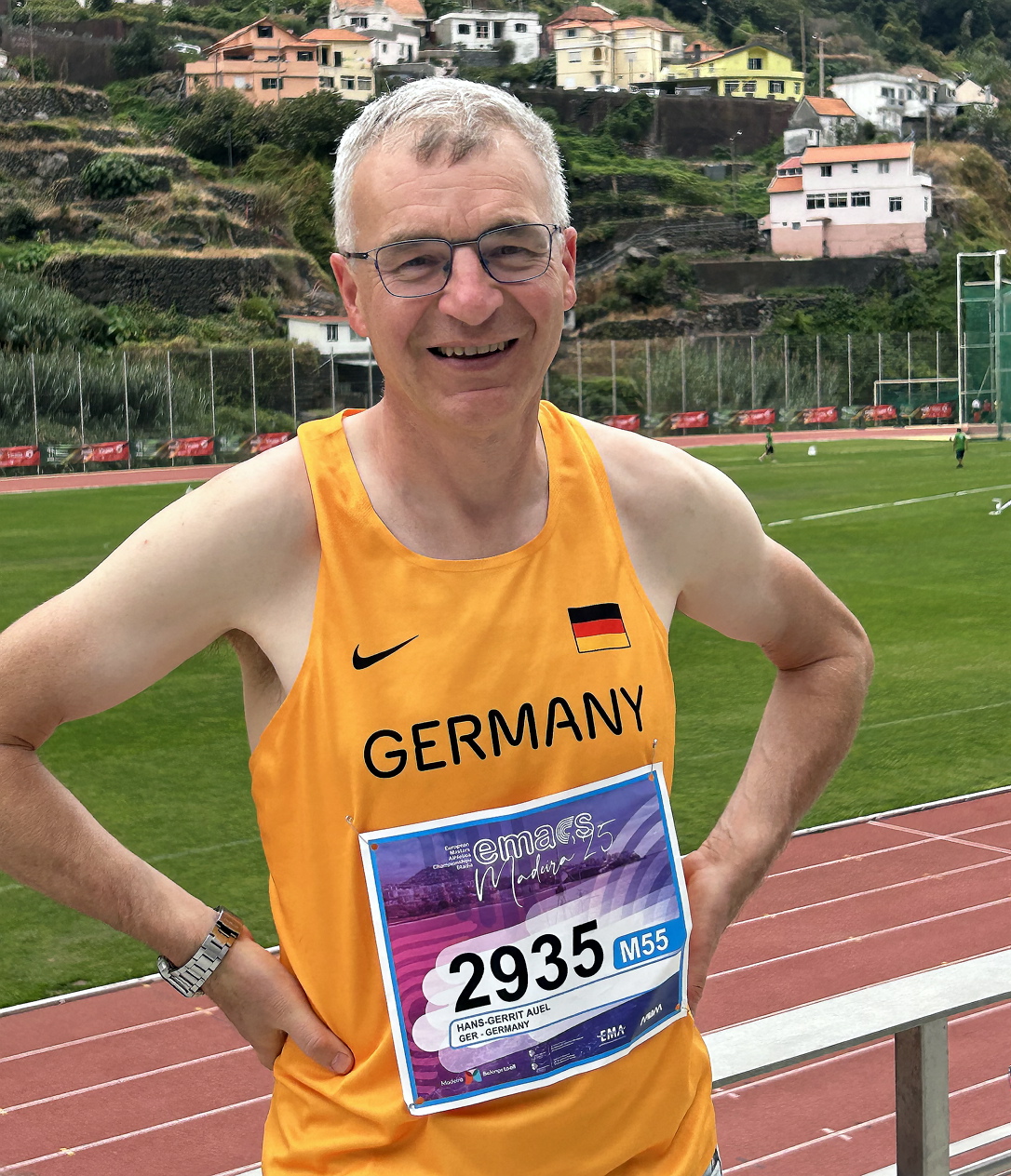 Zwei weitere Plaketten in Silber schmücken die nordhessische Bilanz. Seinen ersten internationalen Auftritt krönte Hans-Gerrit Auel (SC Steinatal) mit dem Silberrang der mit weiterhin Goetz Teutloff, Mario Büchter und Bernd Lachmann in 3:44,32 Minuten deutschen Rekord laufenden 4mal-400-Meter-Staffel. Hinter den Niederlanden (Europarekord) schickte das deutsche Quartett Polen, Italien und Großbriannien ins geschlagene Feld. Überhaupt war der Pfarrer aus Niedergrenzebach in Rekordlaune und verbesserte als Elfter über 800 Meter der M 55 die nordhessische Bestmarke auf 2:12,67 Minuten.